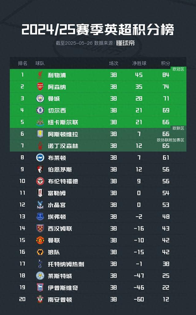 英超完整积分榜:利物浦夺冠,升班马全部降级,曼联15热刺17名